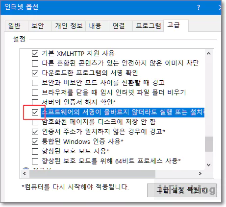 인터넷 옵션 창이 열리면 고급 탭을 선택하고 아래로 스크롤하면 보안 항목이 있습니다. 보안 항목 중 '소프트웨어의 서명이 올바르지 않더라도 실행 또는 설치하도록 허용'에 체크 표시를 해 준 다음 하단의 적용 및 확인을 눌러 줍니다.