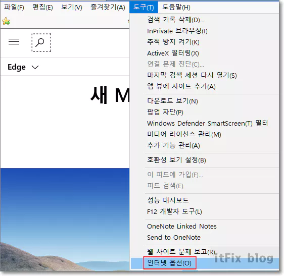 서명 손상 오류가 발생할 경우 익스플로러 상단 메뉴 중 도구를 누르고 인터넷 옵션을 클릭합니다.