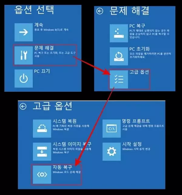 위에서 설명한 과정을 통해 복구모드로 진입한 다음 문제 해결 > 고급 옵션 > 자동 복구를 클릭하여 복구과정을 진행합니다. 이 과정으로 문제가 해결되지 않는 경우에는 다음 단계의 해결을 시도합니다.