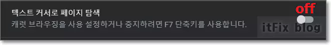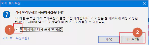 이 기능을 설정한 기억이 없는 데 왜 켜져 있지 하는 의문을 가질 수 있습니다. 그 이유는 캐럿 브라우징이라는 이 기능이 단축키 F7에 의해 활성화되기 때문입니다.