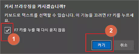 F7 키를 누른 다음 체크 표시를 하고 켜기를 눌러 줍니다. 이렇게 하면 다음 부터 팝업창은 뜨지 않지만 백그라운드에서 상호간의 커서 전환이 일어나게 됩니다.