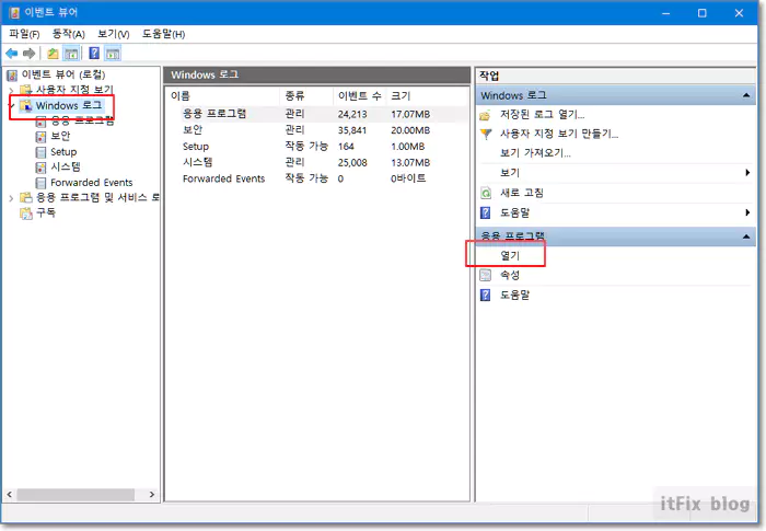 이벤트 뷰어 앱이 실행되면 왼쪽의 항목에서 Windows 로그를 선택합니다. 그다음 가장 오른쪽 창에서 '열기'를 클릭합니다.