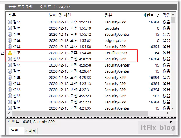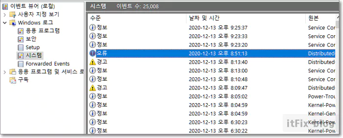 예를 들어 아래에는 제 PC의 이벤트 뷰어 응용 프로그램 기록입니다.