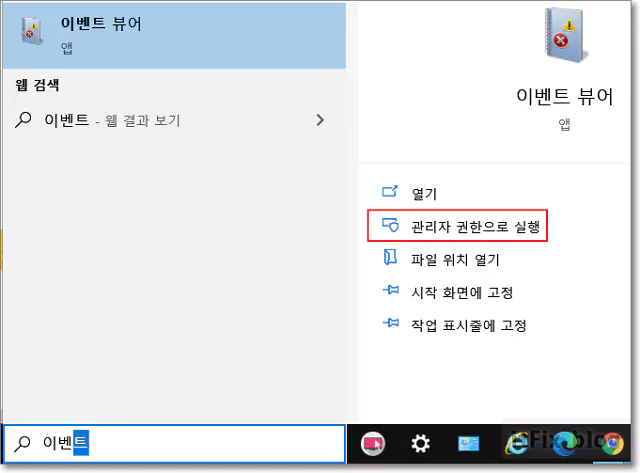 윈도 작업 표시줄에 있는 검색 상자에 이벤트라고 타이핑한 다음 이벤트 뷰어를 관리자 권한으로 실행해 봅니다.