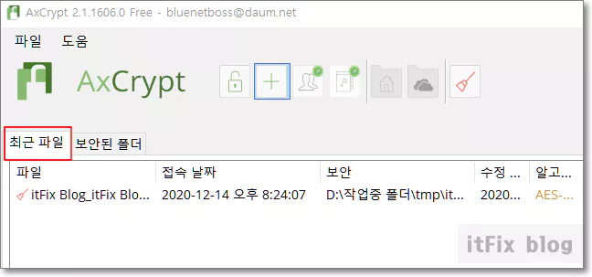 파일을 암호화 하고자 할 경우에는 두 개의 탭 중 최근 파일 탭이 선택된 상태에서 플러스 표시를 눌러 해당 파일을 선택하면 됩니다. 선택하면 자동으로 프로그램 하단에 있는 암호화된 목록의 항목으로 들어가게 됩니다.