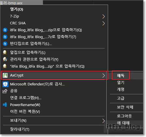 이렇게 암호화된 파일은 기존의 확장자 뒤에 .axx라는 새로운 확장자가 붙게 되며 암호화된 상태로 존재하게 됩니다. 해제할 때에는 AxCRypt에 로그인되어 있는 상태에서는 암호를 입력하지 않아도 열 수 있습니다.