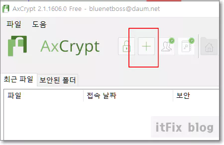 Axcrypt 프로그램을 실행하고 상단의 플러스 표시를 눌러 암호화 할 파일을 선택합니다.