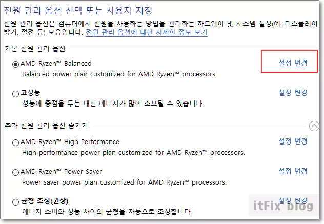 제어판의 전원 옵션으로 들어간 다음 현재 시스템이 사용중인 전원 옵션 우측의 설정 변경을 클릭합니다.