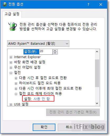 다음 페이지에서 고급 전원 관리 설정 옵션 변경을 클릭합니다. 다음에 나오는 전원 옵션 설정창에서 절전 부분을 클릭해 하위 옵션들을 열고, 절전 모드 해제 타이머 허용 옵션 설정을 사용 안 함으로 만듭니다. 적용 및 확인을 누른 다음 PC를 재시작합니다.