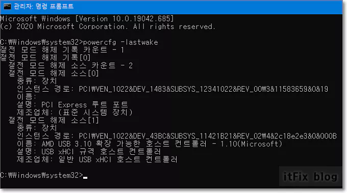만약, 아직도 절전 모드 오류가 해결되지 않았다면 관리자 모드의 명령 프롬프트를 한번 더 실행하여 아래와 같이 입력합니다. 해당 명령어는 절전 모드가 해제된 마지막 원인을 보고하지만 이를 통해서 어느 정도는 오류의 예측을 해 볼 가능성이 있습니다.