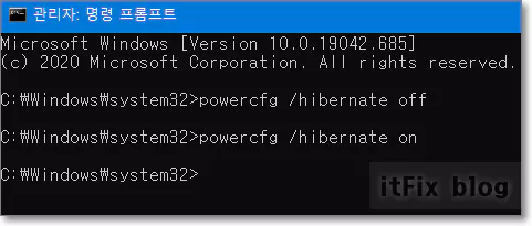 관리자 권한의 명령 프롬프트가 실행되면 아래의 명령어를 입력하여 최대 절전 모드를 끕니다.