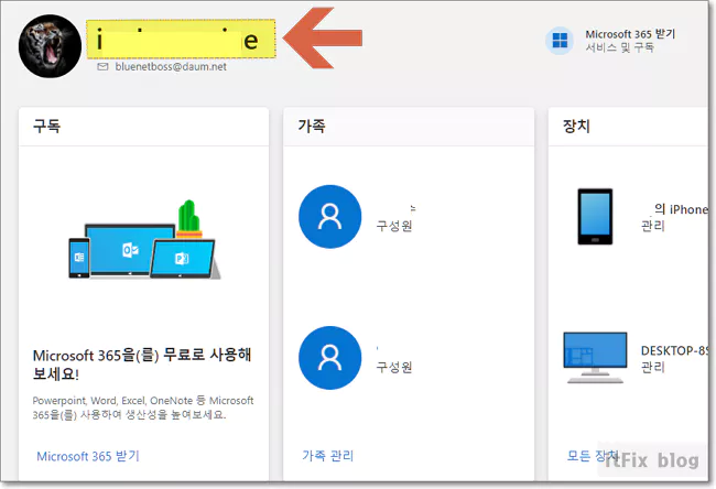 2. MS 웹페이지인 내 계정 관리 페이지에서 좌측 상단의 내 이름 부분을 클릭합니다. 이건 계정 이름이 아니라 계정을 표시해 주는 단순 사용자 이름입니다.