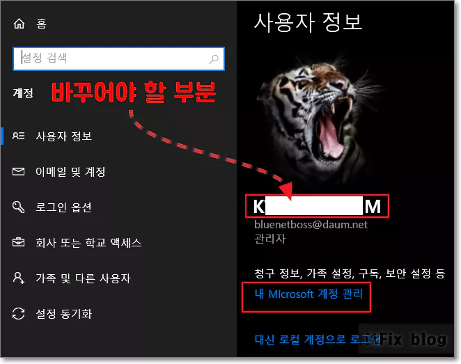 이 문제의 해결에 관하여 구글을 검색해 보면 많은 분들이 netplwiz, userpassword2, 레지스트리 등을 통한 계정명 변경을 언급하는 경우가 많은 데 이는 상당히 위험한 발상입니다. 초보자 분들이 이 부분을 잘 못 건드리면 계정 오류가 발생하여 최악의 경우 윈도우를 재설치해야 할 수도 있습니다.