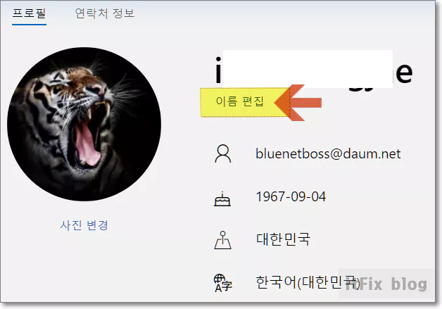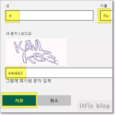 4. 적당한 성과 이름을 적습니다. 성과 이름 부분을 바꾸고자 하는 이름으로 변경하였으면 그림 문자를 입력한 다음 하단의 저장 버튼을 눌러 줍니다. 이 작업을 완료한 다음 PC를 재시작합니다.