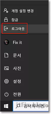 5. 윈도우 설정의 프로필에서는 변경된 것이 보이지만 바탕화면의 내 문서 이름은 변경되지 않았습니다. 이미 변경된 것이지만 PC의 재시작 후에도 일부 적용이 안 되는 경우에는 윈도우 시작 로고를 누른 다음 계정 로그 아웃을 선택합니다.