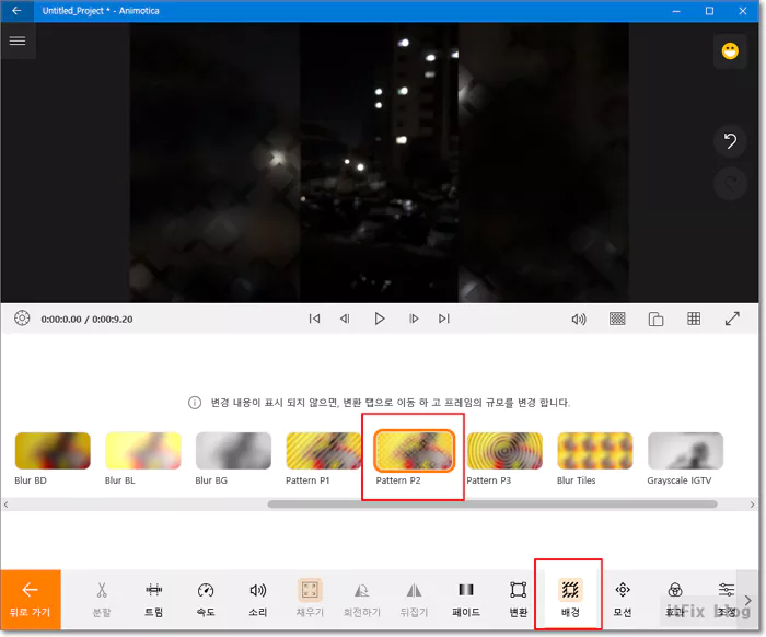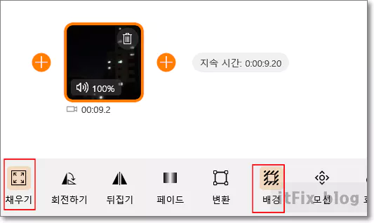 그러면, 다음 이 동영상 설정 페이지로 이동하게 되는 데 이곳에서 살펴볼 옵션은 딱 두 가지만 보면 됩니다. 바로 채우기와 배경입니다.