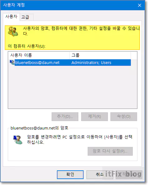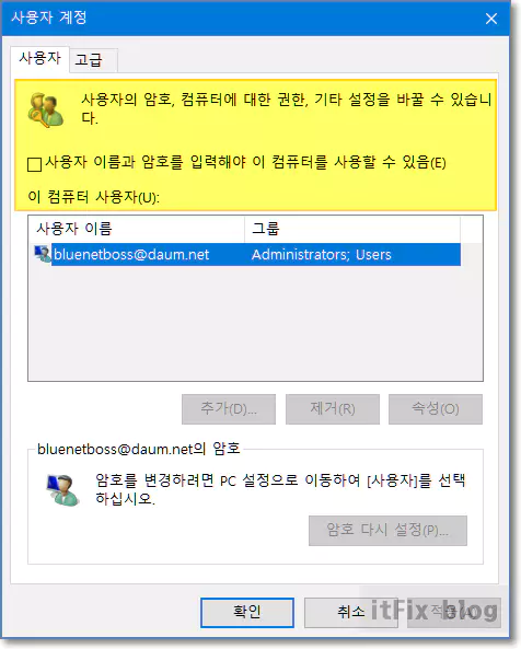 그런데 이 옵션을 구성하기 위해서는 필수적으로 netplwiz를 사용해야 하며, netplwiz를 연 다음 '사용자 이름과 암호를 입력해야 이 컴퓨터를 사용할 수 있음' 옵션을 체크 해제해야 합니다.