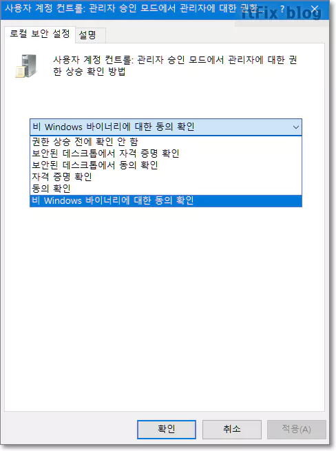해당 옵션을 더블 클릭한 다음 로컬 보안 설정 탭의 드롭다운 메뉴를 클릭하면 몇 개의 옵션이 보입니다. 이 중에서 '비 Windows 바이너리에 대한 동의 확인' 옵션을 선택해 준 다음 하단의 적용 및 확인 버튼을 클릭해 줍니다.