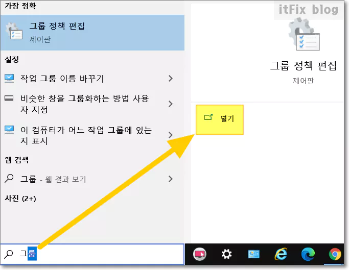 윈도우 작업 표시줄의 검색 상자에 그룹이라고 입력한 다음 상단의 그룹 정책 편집 열기를 클릭합니다.