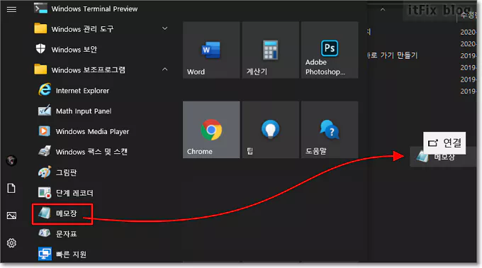탐색기가 위 이미지의 경로로 열려 있는 상태에서 윈도우 시작 버튼을 누른 다음 보조 프로그램에 있는 메모장 아이콘을 마우스로 클릭하여 그대로 드래그해서 이 위치에 놓습니다.