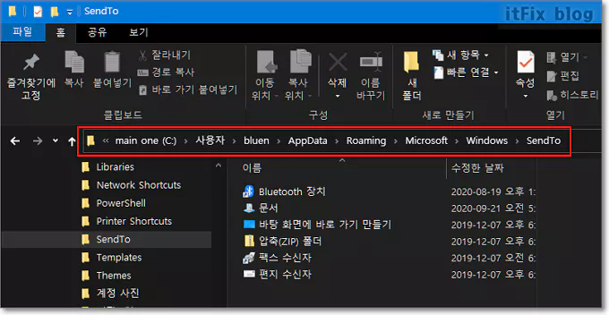 우선 파일 탐색기를 열고 보내기 아이콘들이 모여 있는 아래의 경로로 들어 갑니다.