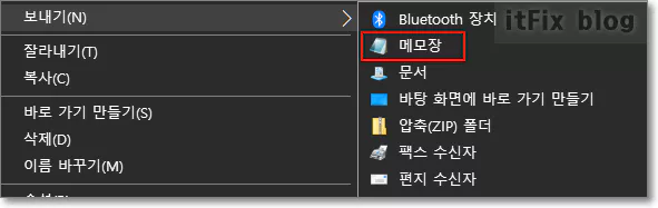 이제 보내기에 메모장을 추가하는 작업이 끝났습니다. 아래에서 보는 바와 같이 보내기 메뉴에 메모장이 잘 들어가 있습니다.