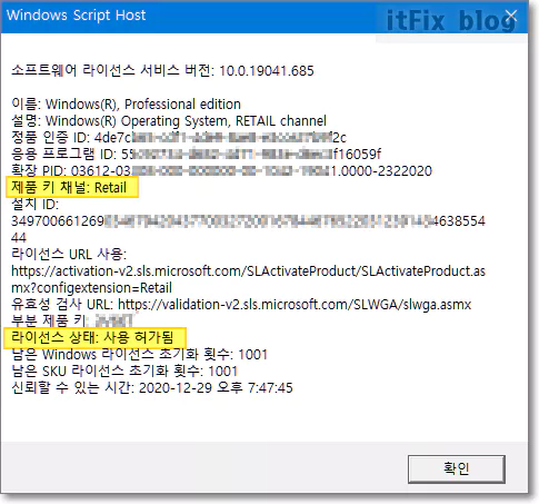 위의 명령을 입력한 후 팝업되는 윈도우 라이선스 정보창에서는 아래의 이미지에서처럼 라이선스의 종류와 상태를 살펴볼 수 있습니다.