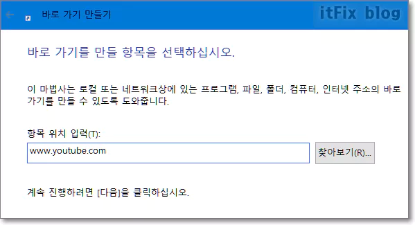 다음 화면에서 항목 위치 입력 칸에 www.youtube.com을 입력하고 다음을 클릭합니다. 다음 창에서 바로가기의 적당한 이름을 지어 주고 마침 버튼을 클릭하면 작업이 끝이 나게 됩니다.