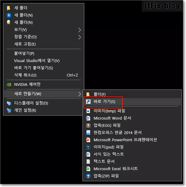 바탕화면의 빈 공간에서 마우스 우클릭한 다음 새로 만들기 > 바로 가기를 클릭합니다.