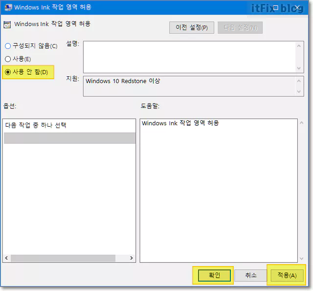 Windows Ink 작업 영역 허용 편집창이 팝업되면 기본 설정인 구성되지 않음을 사용 안 함으로 변경한 다음 적용 및 확인 버튼을 눌러 줍니다.