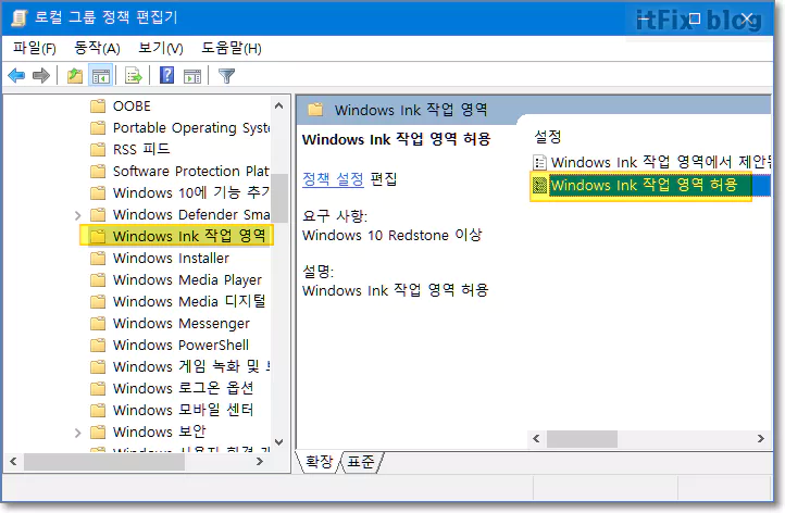Windows Ink 작업 영역 항목을 선택한 상태에서 우측의 내용 중 'Windows Ink 작업 영역 허용'을 더블 클릭합니다.