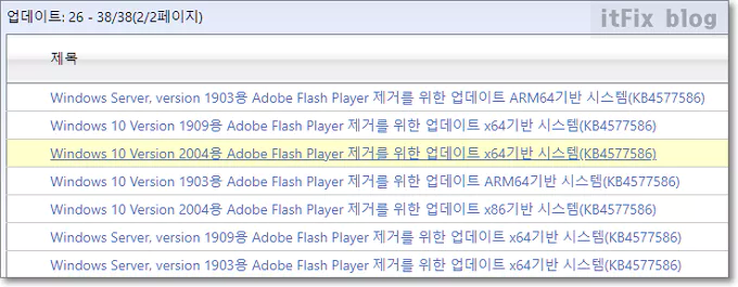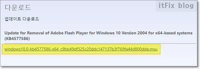 아래의 MS 플래시 제거 업데이트 다운로드 페이지에서 자신의 운영체제 버전과 일치하는 체거 패치를 다운로드하여 실행하면 됩니다. 이 패치 파일은 OS 종류에 따른 구분과 상관없이 KB4577586이라는 이름이 붙어 있습니다.