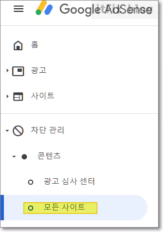 1. 구글 애드센스에 로그인한 후 차단 관리 > 모든 사이트 경로로 진입합니다.