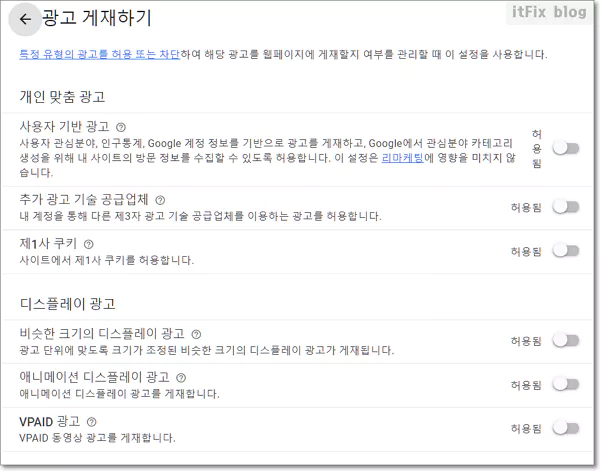 3. 기본적으로 광고 게재 관리에 있는 항목들은 이 카테고리가 차단 카테고리이므로 꺼져 있으면 허용하고 있는 것입니다. 즉, 열거된 항목들은 모두 허용되어 있습니다.