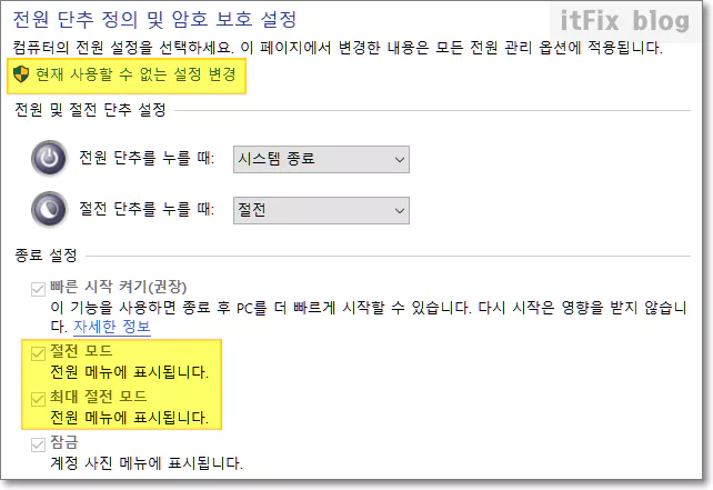 전원 단추 작동 설정 항목에서 종료 설정이 희미하게 모두 체크 표시되어 있는지 살펴봅니다. 이중 특히, 절전 모드나 최대 절전 모드에 체크 표시가 없다면 위쪽의 현재 사용할 수 없는 설정 변경을 클릭한 다음 체크 표시로 수정해 줍니다.