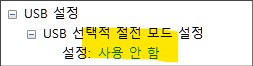 USB 설정에서 선택적 절전 모드 설정을 사용 안 함으로 바꾸어 줍니다.