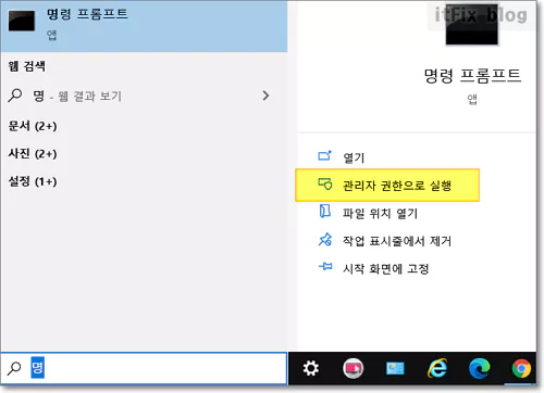 윈도우 작업 표시줄의 검색 상자에 명령 프롬프트라고 입력한 다음 관리자 권한으로 실행합니다.