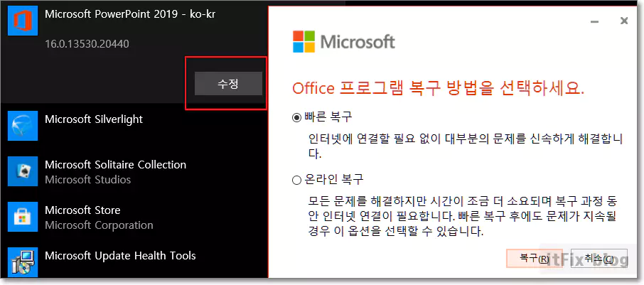0xc0000142 오류를 일으키는 가장 많은 앱으로 지목되는 MS 오피스 프로그램의 경우에 윈도우 설정 > 앱에서 Microsoft Office 365를 찾은 다음 이 항목을 누르고 수정 버튼을 누릅니다. 그러면 빠른 복구와 온라인 복구 옵션 모두 보이는데 시간이 좀 걸리지만 두가지 방법 모두를 시도해 봅니다.