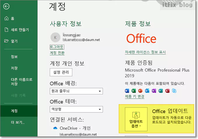 파일 > 더보기 > 계정 > 오피스 업데이트 > 업데이트 옵션 > 지금 업데이트에서 해당 제품을 업데이트 할 수 있습니다.