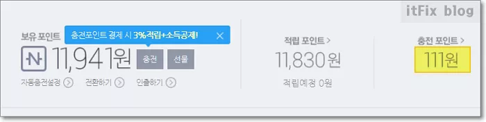 이 중에서 실제 현금으로 환전하거나 계좌이체받을 수 있는 것은 충전 포인트에 한 합니다. 즉, 위의 이미지에서처럼 충전 포인트로 표시되는 111원만 연결 계좌를 등록하여 계좌이체받는 현금화가 가능한 포인트인 것입니다.