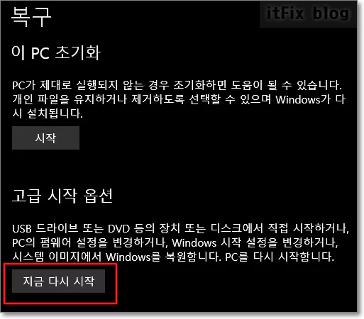 윈도우 설정 > 업데이트 및 보안 > 복구로 이동한 다음 지금 다시 시작 버튼을 클릭하여 파란색의 윈도우 복구 화면으로 진입합니다.