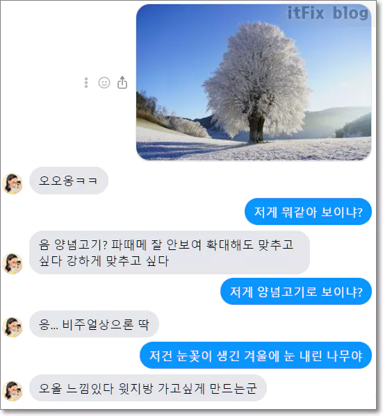 겨울나무를 양념고기로 표현하더군요. 속으로 웃었는데, 제가 사진은 겨울 나무라고 설명하자 바로 그에 맞는 대화 내용으로 대답해 주더군요. 이것이 자신이 오류 수정 학습을 완료했다는 말인지는 모르겠지만 빠른 태세 전환이 놀라웠습니다.