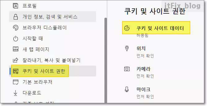 2. 좌측의 메뉴에서 쿠키 및 사이트 권한을 선택한 다음 우측의 항목에서 '쿠키 및 사이트 데이터'를 클릭합니다.