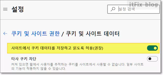 3. 다음 페이지에서 가장 위쪽에 보이는 '사이트에서 쿠키 데이터를 저장하고 읽도록 허용(권장)'의 스위치를 클릭하여 기능을 켭니다.