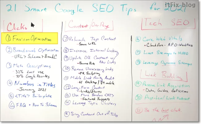 파비콘 최적화를 1순위 SEO로 거론하고 있는 21 Smart google SEO Tips의 스크린 샷 이미지입니다.