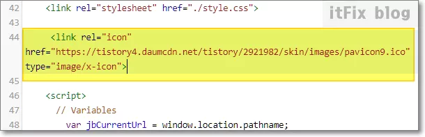 제 블로그의 경우에는 파비콘 파일이 등록되어는 있지만 HTML 편집의 Head 구간에서 파비콘 경로에 대한 코드가 보이지 않습니다. 가능하다면 명확하게 Head 구간에서 파비콘의 경로를 언급해 주는 것이 좋으며, 파비콘의 경로 언급에 대한 코드는 다음과 같습니다.