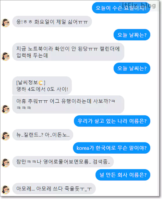 그외에 무리한 요구인지는 모르겠으나 이루다의 갈길이 멀어 보이는 이유는 아래의 스크린 샷으로 대체합니다. 오늘은 1월 10일 일요일입니다.