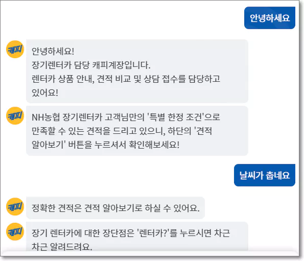 아래의 이미지는 농협 장기렌터카 챗봇 캐피계장과의 대화입니다.