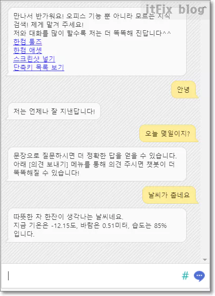 아래의 이미지는 한컴 오피스 챗봇 오피스챗과의 대화입니다.