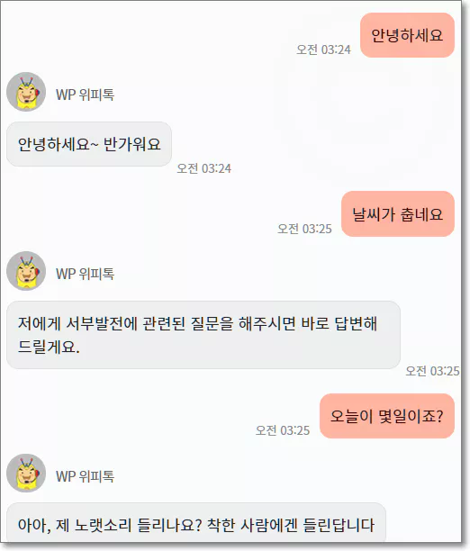 아래의 이미지는 서부발전의 챗봇 위피톡과의 대화입니다.